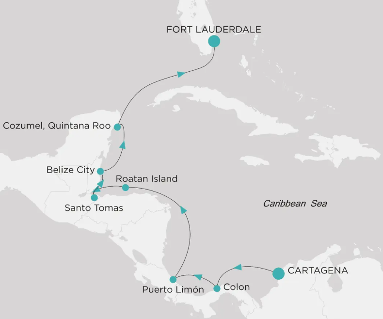 Sailing from Cartagena to Fort Lauderdale is a vibrant journey through the heart of Central America and the Western Caribbean, blending colorful cultures, tropical landscapes, and unforgettable coastal cities. After departing Cartagena’s historic walled old town, your voyage calls on Colon, gateway to the Panama Canal, followed by lush Puerto Limón, where rainforest adventures and rich Afro-Caribbean heritage await. Next comes Roatán, famous for crystal-clear waters and vibrant coral reefs—perfect for snorkeling, beach time, or simply soaking in island life.