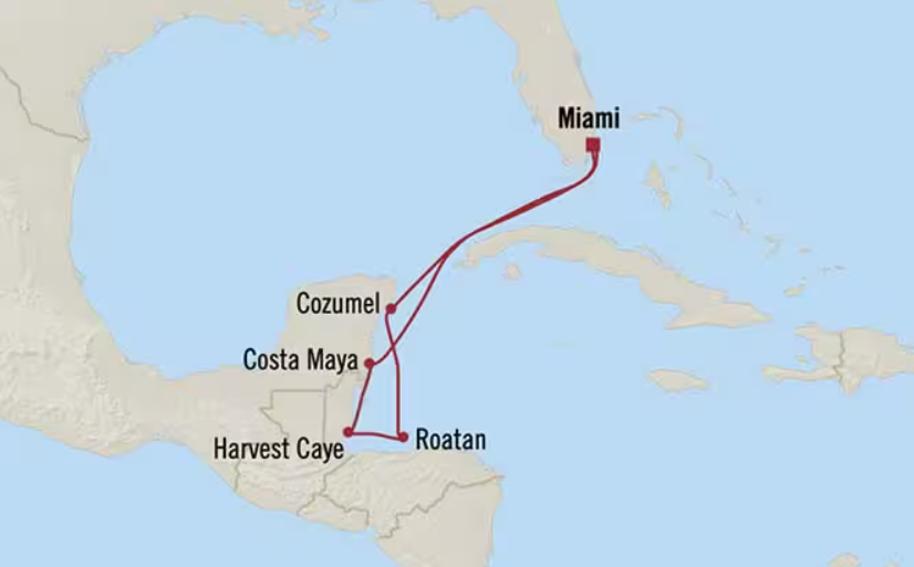The itinerary showcases some of the Western Caribbean’s most inviting destinations. Explore the vibrant island of Cozumel, known for its turquoise waters and rich culture; discover the natural beauty and snorkeling paradise of Roatan; enjoy laid-back island time at Harvest Caye; and step into history along the shores of Costa Maya. Between ports, unwind onboard with attentive service and refined comforts, making this weeklong Caribbean journey both enriching and effortlessly enjoyable.