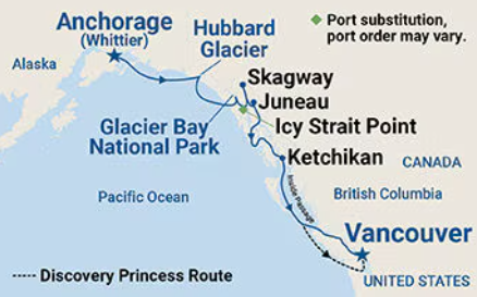Along the journey, the ship sails past the massive Hubbard Glacier, one of Alaska’s most active and awe-inspiring glaciers, where guests can witness towering walls of ice calving into the sea. The voyage also includes scenic cruising through the magnificent Glacier Bay National Park, a UNESCO World Heritage Site known for its glaciers, wildlife, and untouched wilderness. Guests will also explore charming frontier ports including Skagway, famous for its Gold Rush history, Juneau, Alaska’s scenic capital surrounded by mountains and glaciers, and Ketchikan, known for its colorful waterfront, Native Alaskan culture, and world-class salmon fishing. This unforgettable Alaska cruise combines breathtaking natural wonders with the signature hospitality and timeless elegance that Princess Cruises is known for.