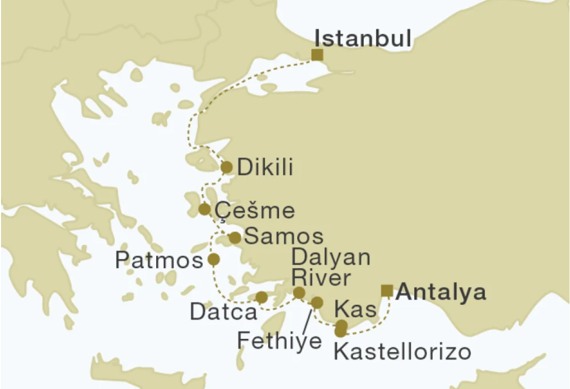 Along the way, the voyage reveals a tapestry of cultures, islands, and coastal villages. Guests explore the seaside charm of Dikili and the lively harbor town of Cesme, before crossing into Greece to visit the beautiful island of Samos and the spiritual island of Patmos. Returning to Turkey’s scenic coastline, the itinerary includes the peaceful peninsula of Datça, the natural beauty of the Dalyan River, and the stunning turquoise waters surrounding Fethiye. The journey continues to the charming harbor town of Kaş and the tiny Greek island of Kastellorizo, known for its colorful waterfront and peaceful atmosphere, before concluding in vibrant Antalya on Turkey’s Mediterranean coast.
