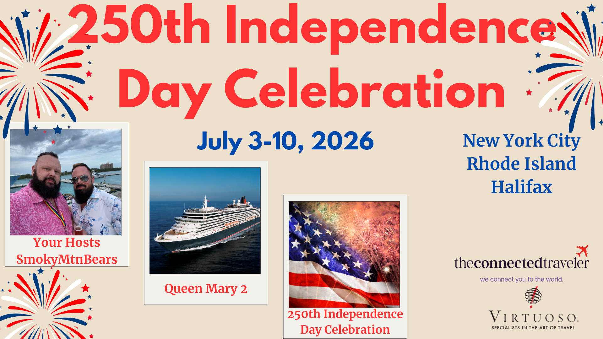 May 15, 2025 – The Connected Traveler, a leader in luxury travel storytelling, is honored to announce that Sean Hornbeck and Scott King have been selected as the Virtuoso Voyages hosts for Cunard's monumental "Independence Day Spectacular Voyage" aboard the Queen Mary 2. This iconic sailing, part of the Sail4th 250 festivities, will commemorate America’s 250th anniversary in grand maritime style.