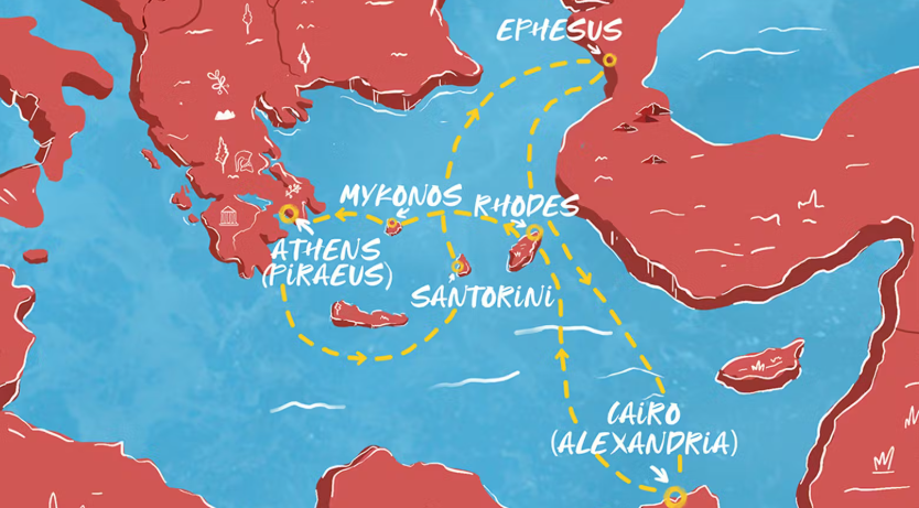 Sailing on Virgin Voyages’ Scarlet Lady roundtrip from Athens is a Mediterranean adventure that perfectly blends ancient history, iconic islands, and modern, adults-only luxury. Your journey begins in Greece’s legendary capital before heading to breathtaking Santorini, where dramatic cliffs, blue-domed churches, and unforgettable sunsets set the mood. Next, step back thousands of years in Ephesus, exploring remarkably preserved ruins, then continue on to historic Alexandria, a fascinating coastal city rich with culture, archaeology, and seaside charm.